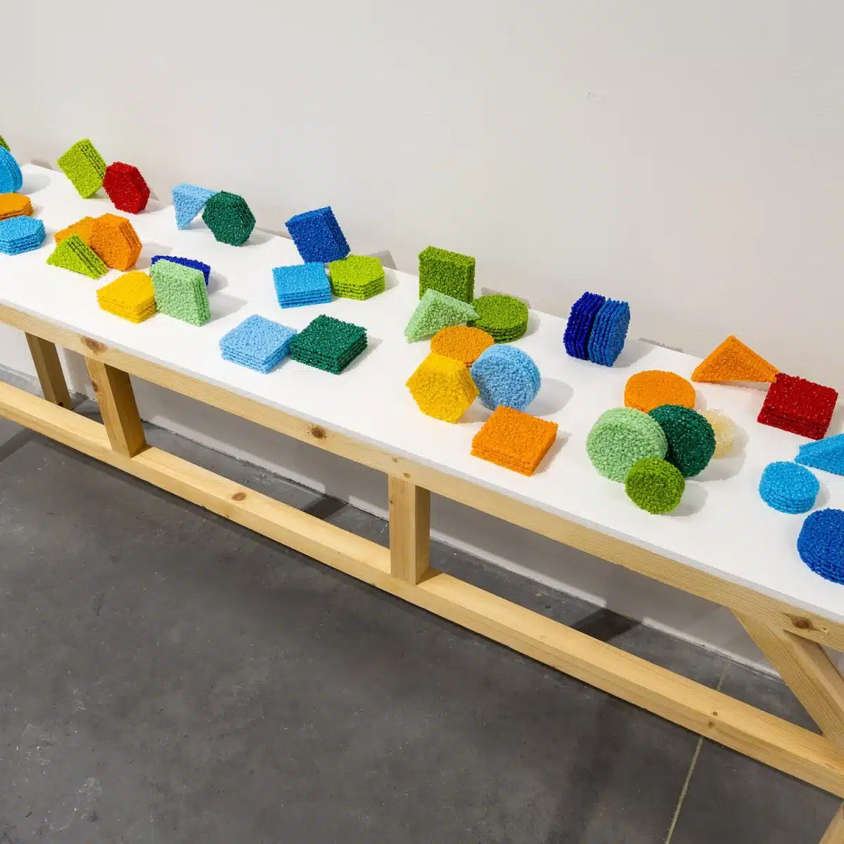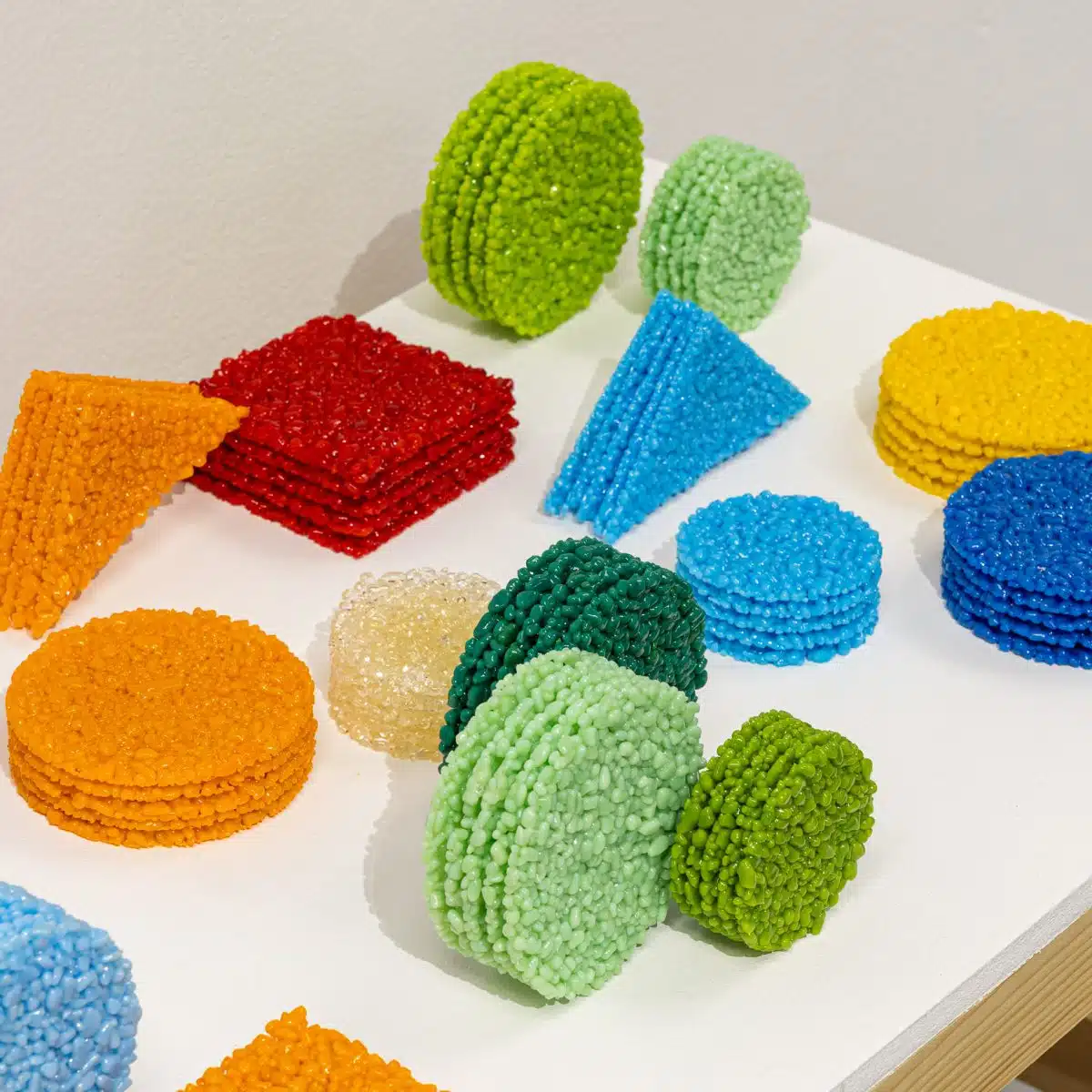 I chose four geometric shapes; circle, square, hexagon and triangle, as these are the building blocks used to understand and create our world. I selected bright bold colours as they catch the eye immediately – you can’t help wanting to interact with the pieces to create a new composition of shapes and colours. And there is also a tension between the fascination of playing with these pieces and realising they are glass, so can break if handled incorrectly. The glass material reminds us how fragile everything actually is and how we must handle all interactions with care.