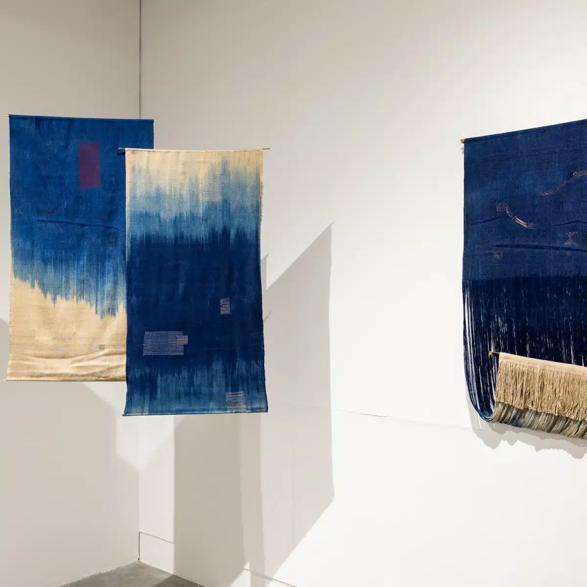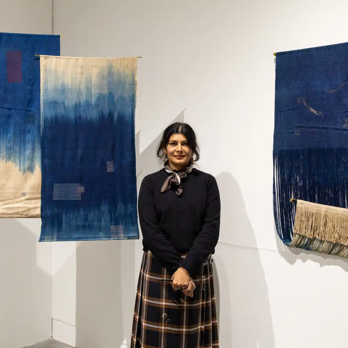 As a British Bengali, weaving helps me navigate two cultural lineages. By combining Bengali Indigo and a supplementary-weft technique with a Western sculptural approach, influenced by artists like Eva Hesse and Peter Collingwood, I reconnect with ancestral practices while questioning romanticised ideas of South Asian craft. The copper threads reference antique tapestries and the storytelling tradition embedded in cloth, allowing me to weave together memory, material, and the wider history of diaspora.