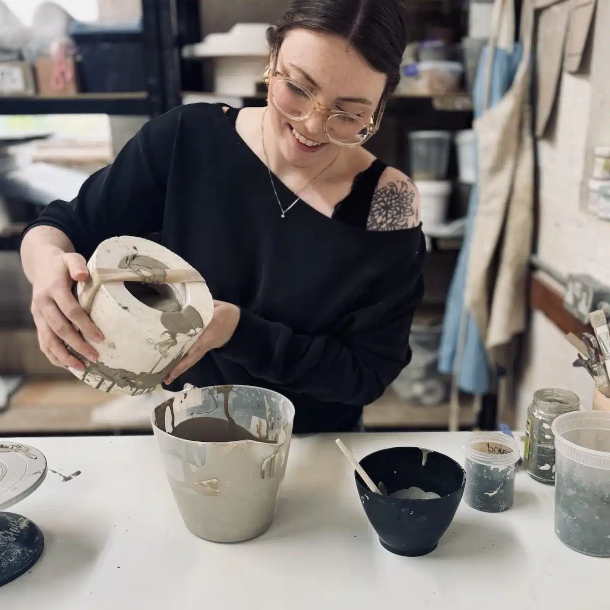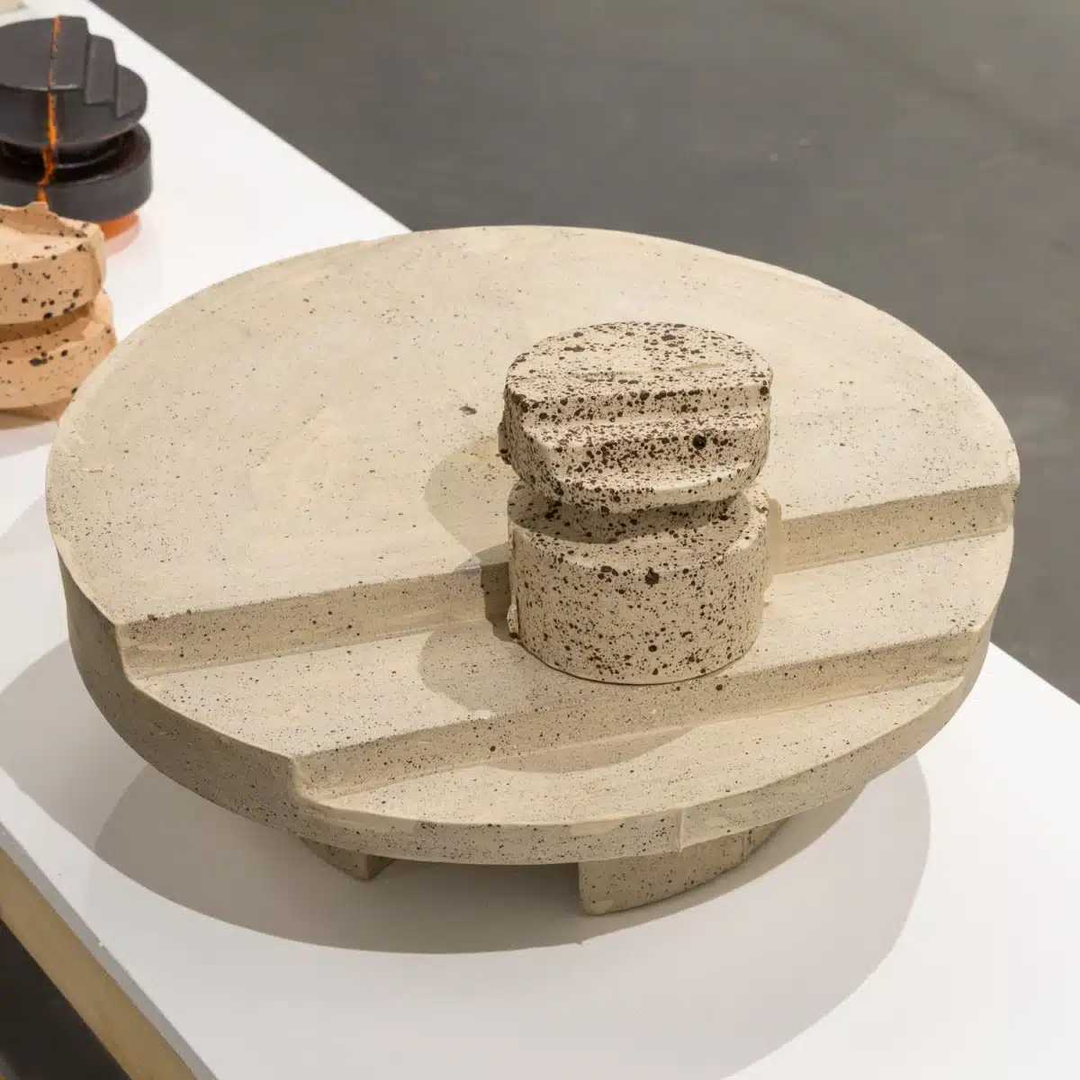 Landris responds to the theme by exploring how materials hold meaning through place and memory. Kvika (a platter) and Moli (a jar) are two ceramic pieces that interact as a sculptural table setting. Their forms are inspired by London’s architecture and made using slip casting techniques with stoneware slip, lava fragments, wild clay, and black sand collected from the Icelandic landscape.