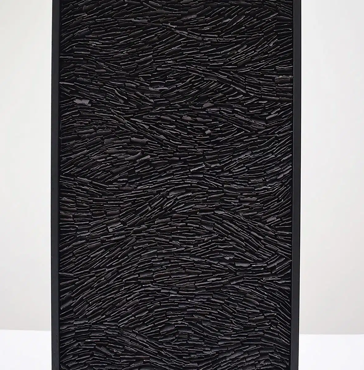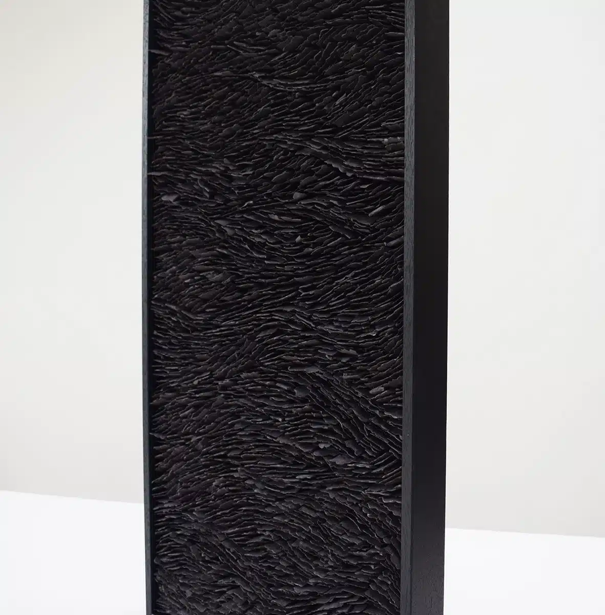 She draws her inspiration from the Dorset coastline, using its fragility, shifting forms, and the muted hues of black, greys, greens and blues, to inform both the colour palette and structure of her work.