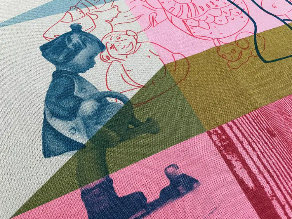 Photography is a prominent feature of Michelle’s work. She is often drawn to graphic imagery and pattern that she sources from her surroundings; each edited and enlarged photograph, or section of a photograph, becoming part of an artwork. She is always looking for potential imagery around her and framing it in her mind’s eye. More recently however, Michelle has focused on the personal for her imagery; she took over 400 photographs for her Collect Open project of items from her mother’s sewing cabinet, and nearly as many of her family home and the ornaments within, for this year’s Collect. Designing the composition is a substantial part of her work: drawing by hand, taking and editing photographs in photoshop and getting imagery ‘silk-screen-ready’ is very time consuming.