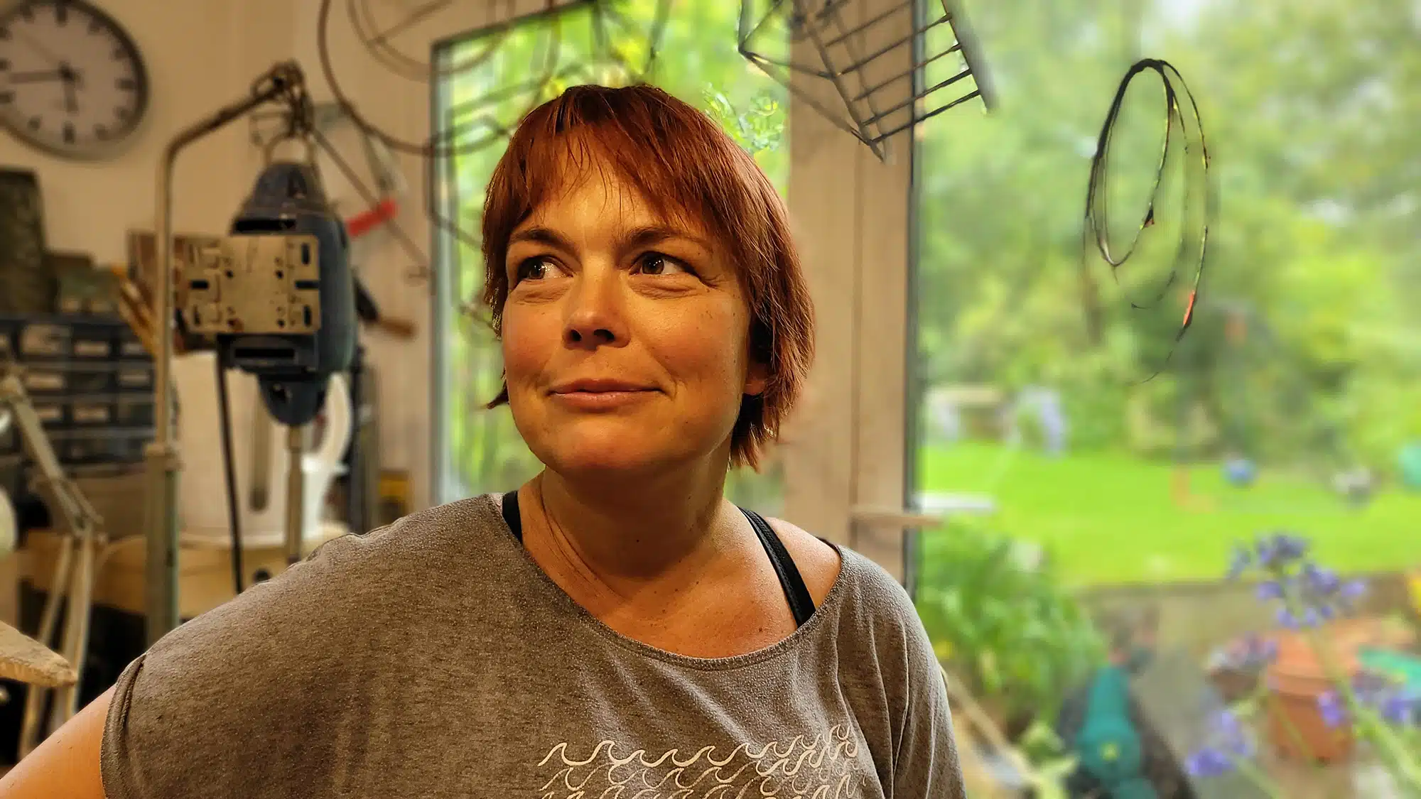 Head and shoulders of woman in front of windpw