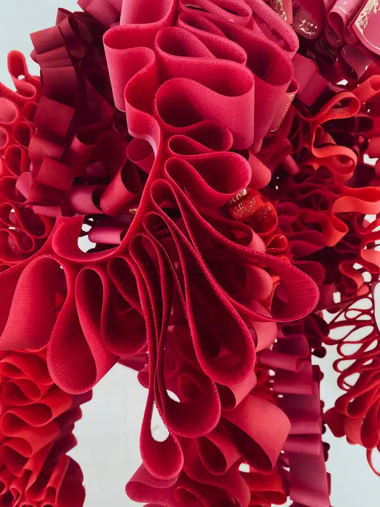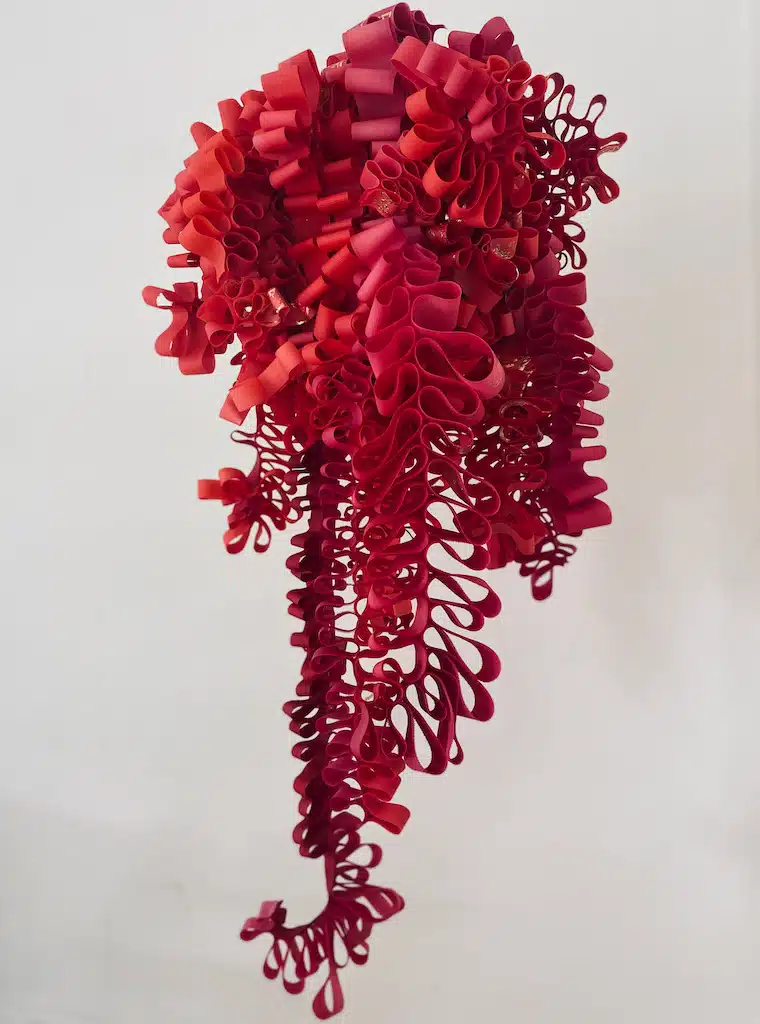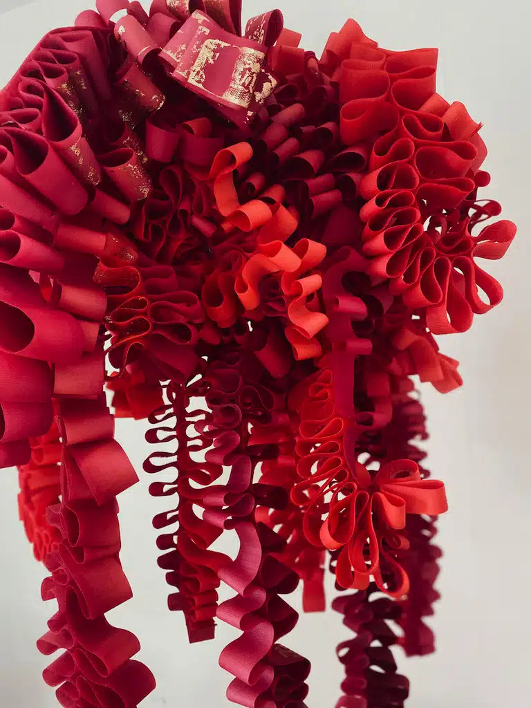 Recently Rachel has re-ignited her passion for colour, previously central to her work, but absent in recent years. New work is the beginning of her exploration into why she stopped using colour, and how she will reintroduce it into her practice. ‘Ignition’ is sculpted from hand-dyed Velcro ribbons, in tones of red and oranges with copper foiled highlights. Rachel enjoys repurposing materials: her underlying structures are hanging basket frames. The Ignite piece is easily modified to have a centrally light.